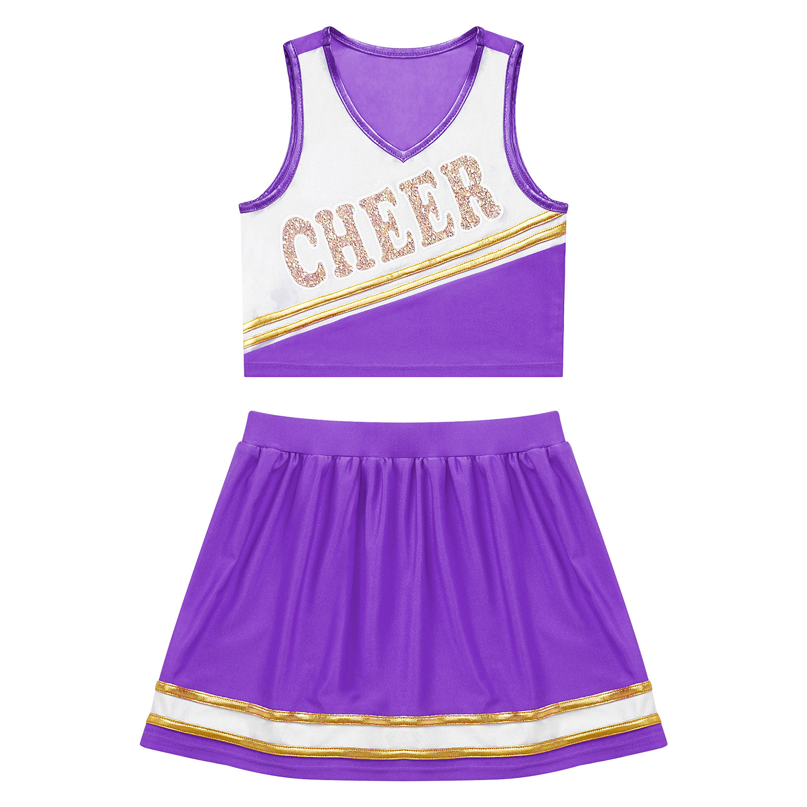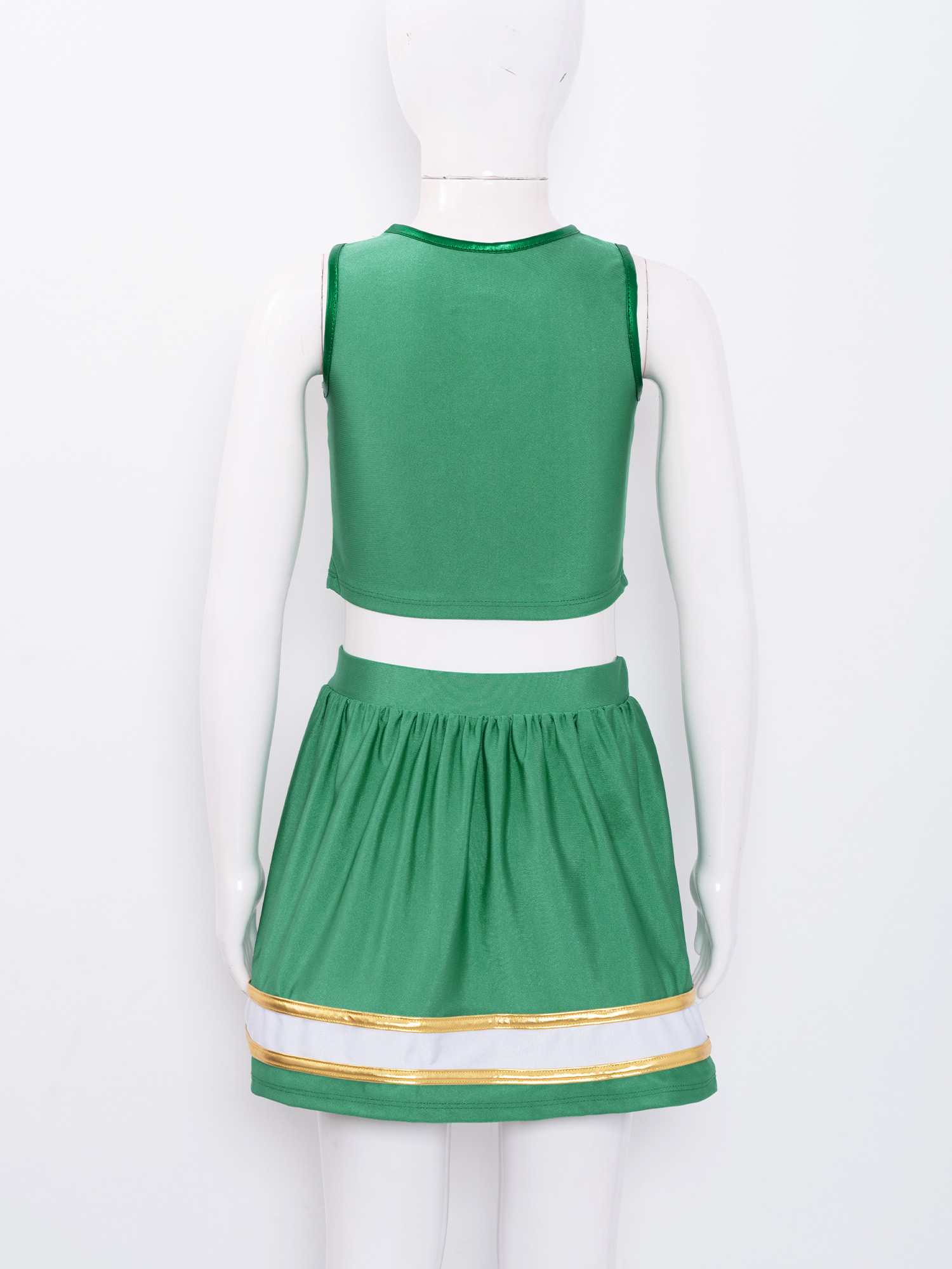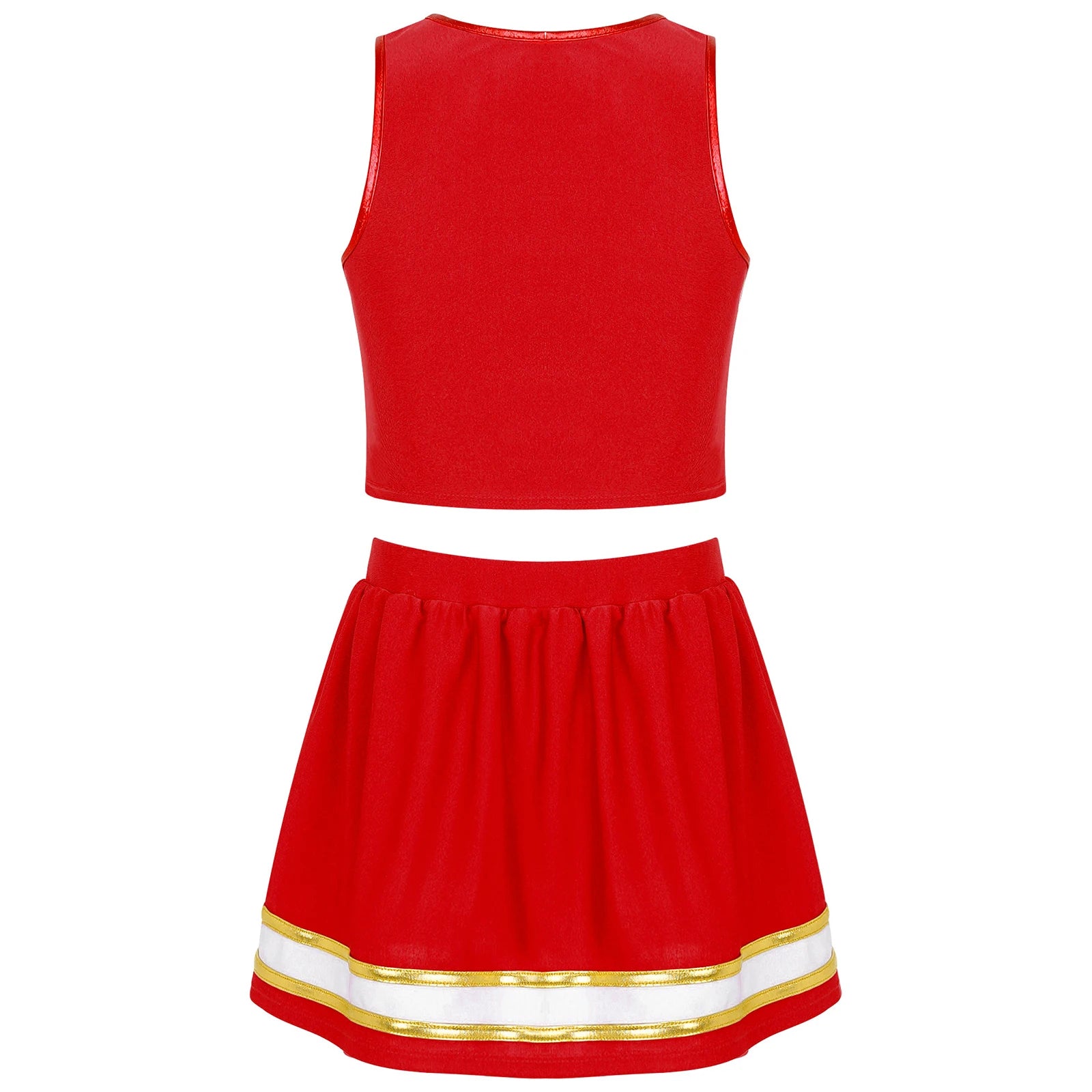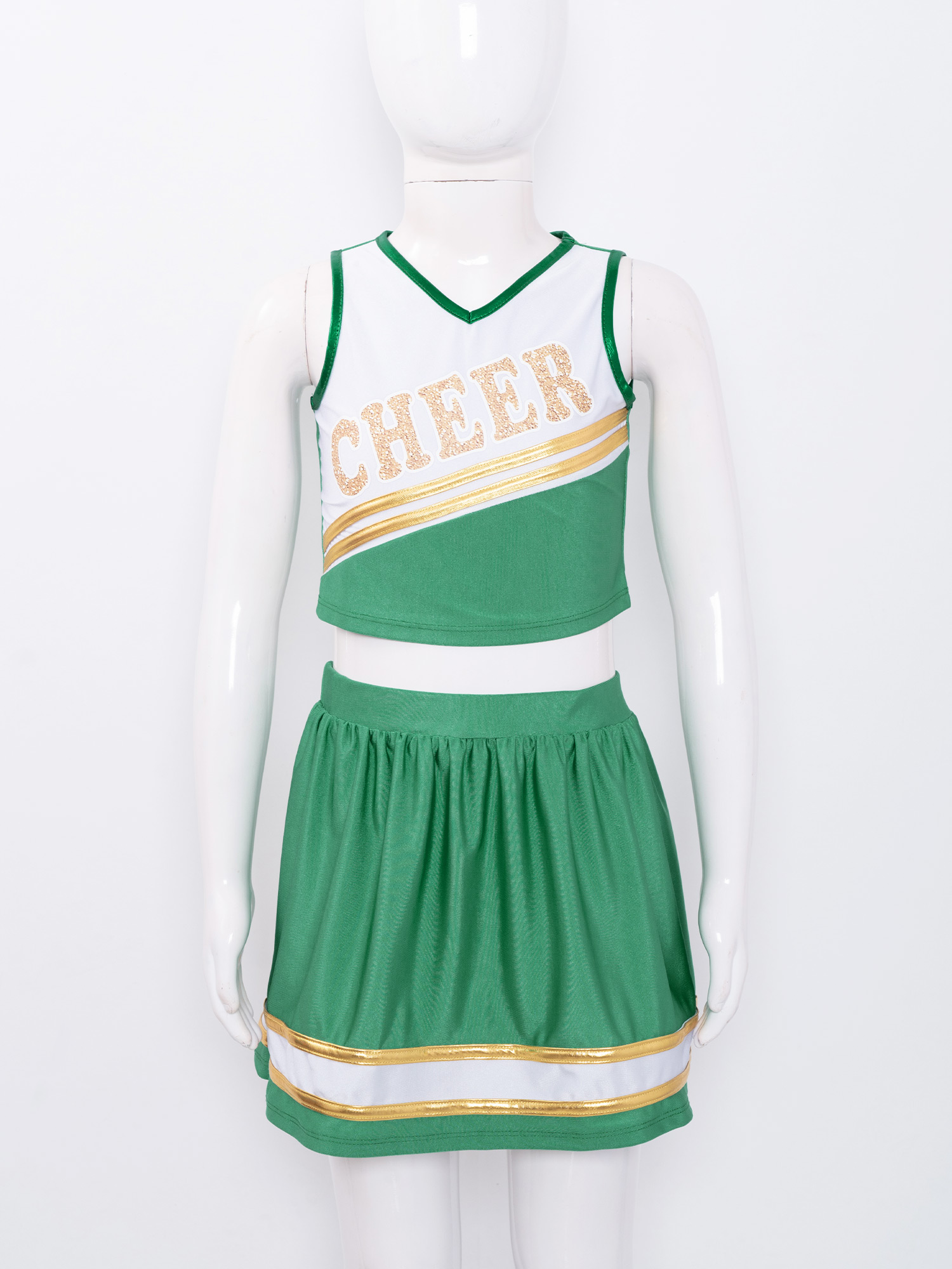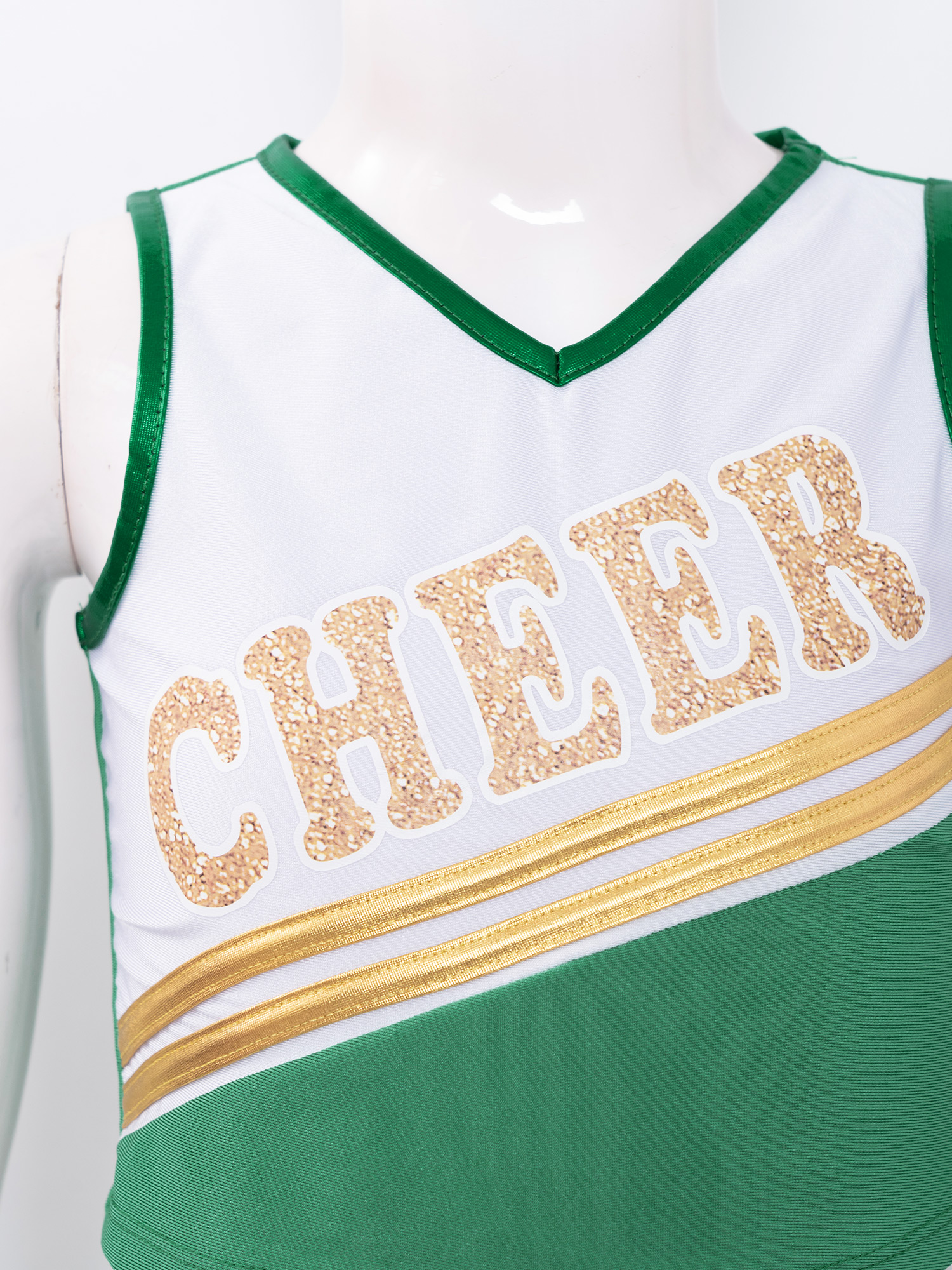 بلوزة قصيرة للبنات بدون أكمام وفتحة رقبة على شكل حرف V، وتفاصيل خطوط معدنية وتصميم مرقع، وطباعة الحرف "CHEER" في المقدمة.