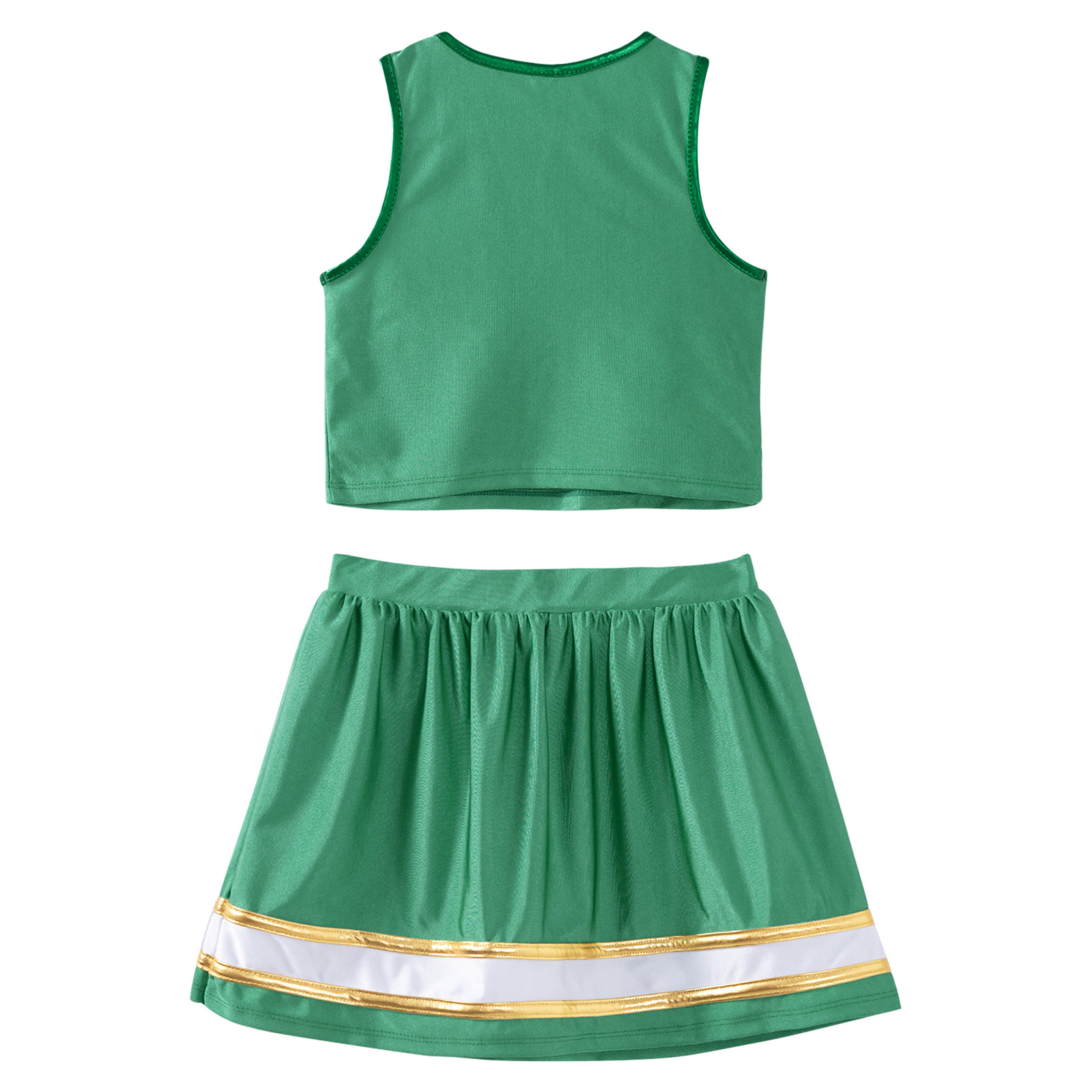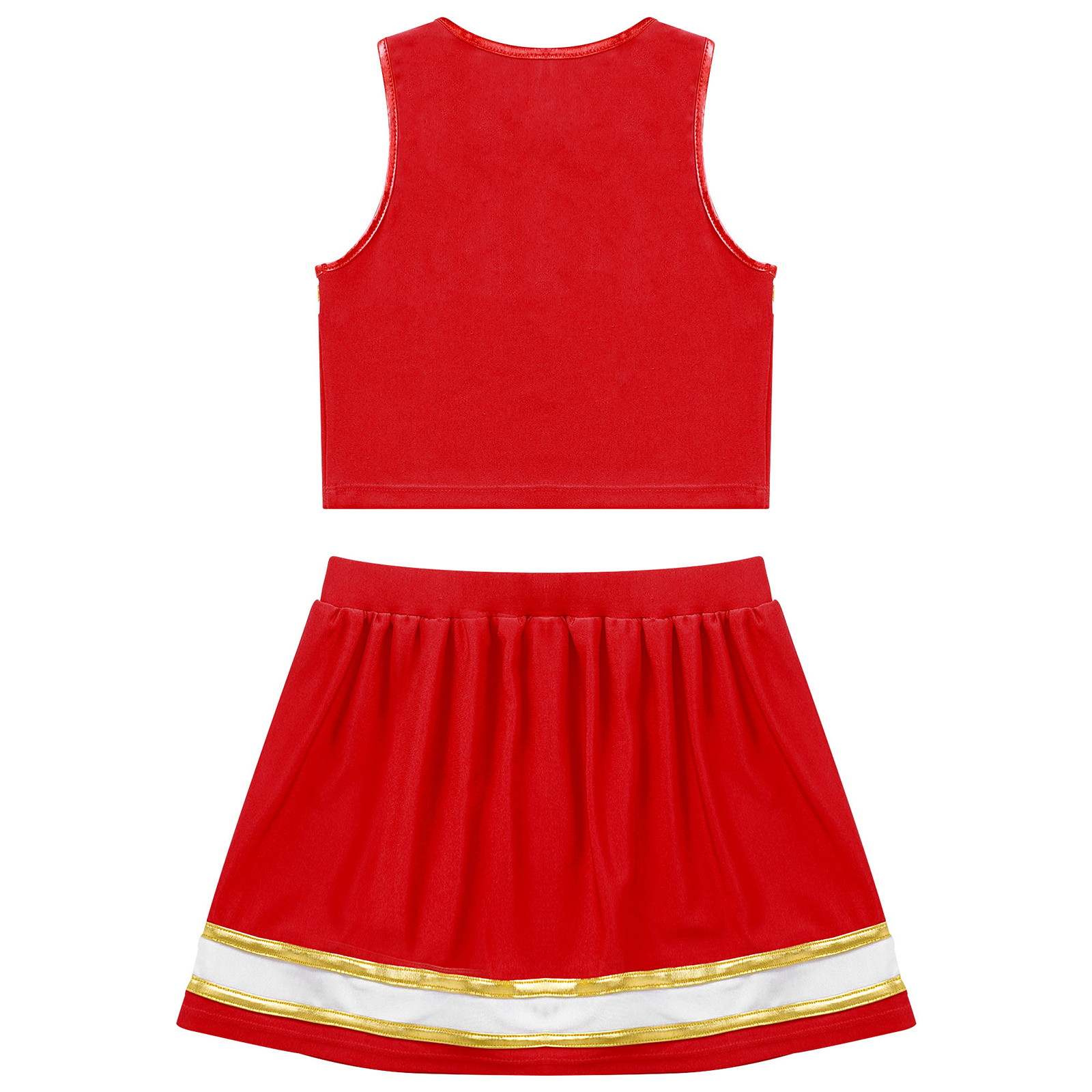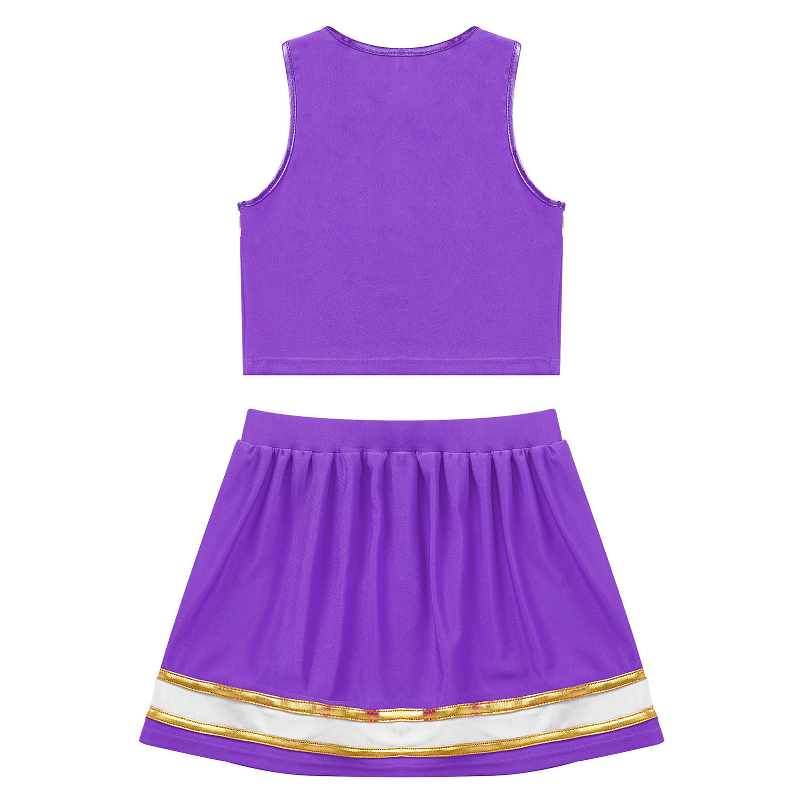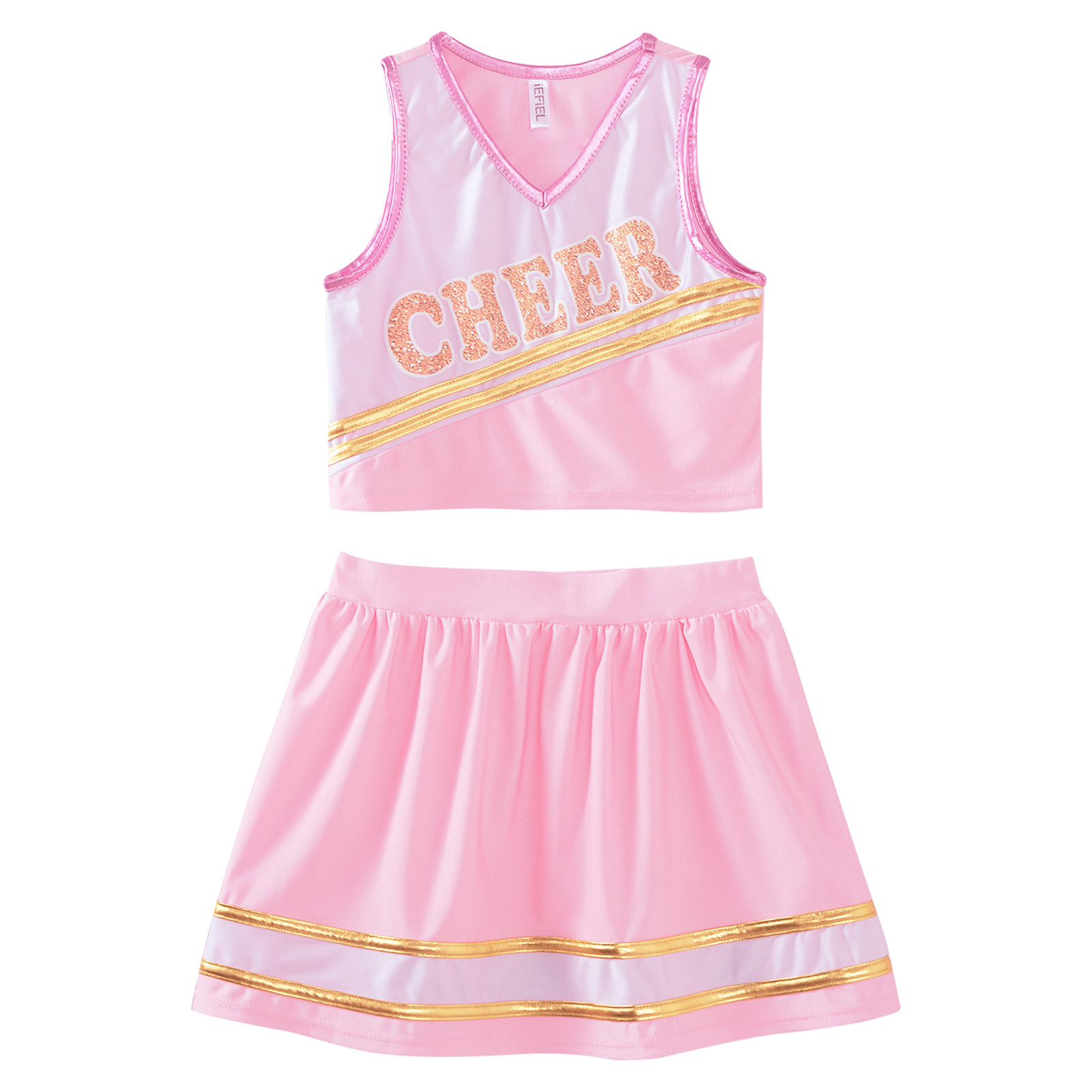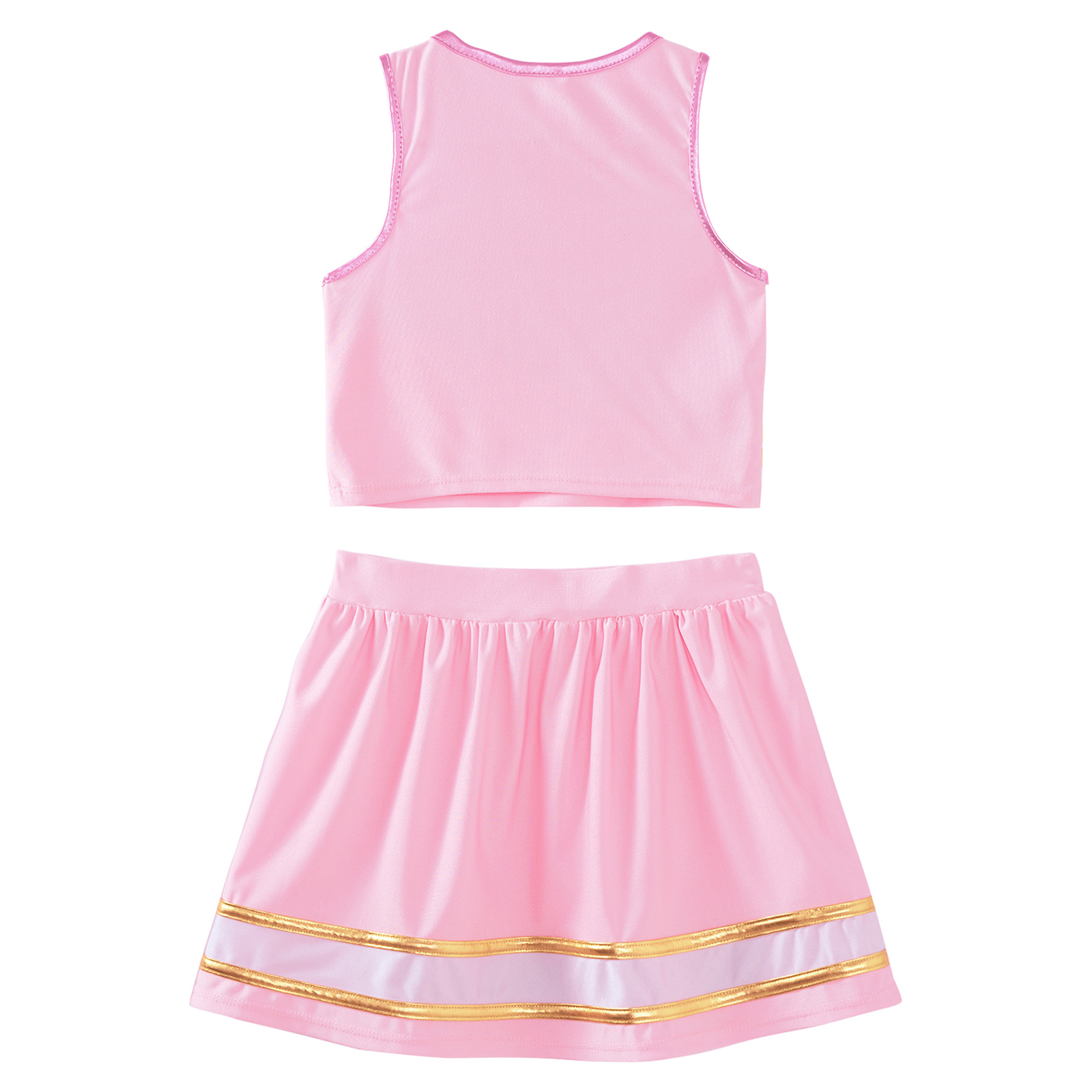 بلوزة قصيرة للبنات بدون أكمام وفتحة رقبة على شكل حرف V، وتفاصيل خطوط معدنية وتصميم مرقع، وطباعة الحرف "CHEER" في المقدمة.