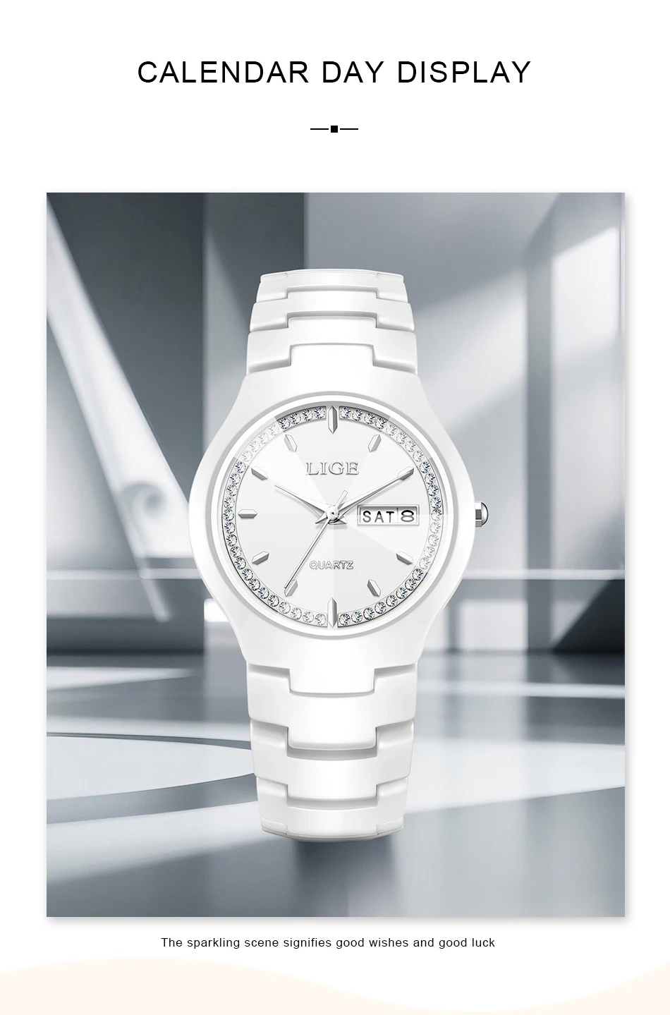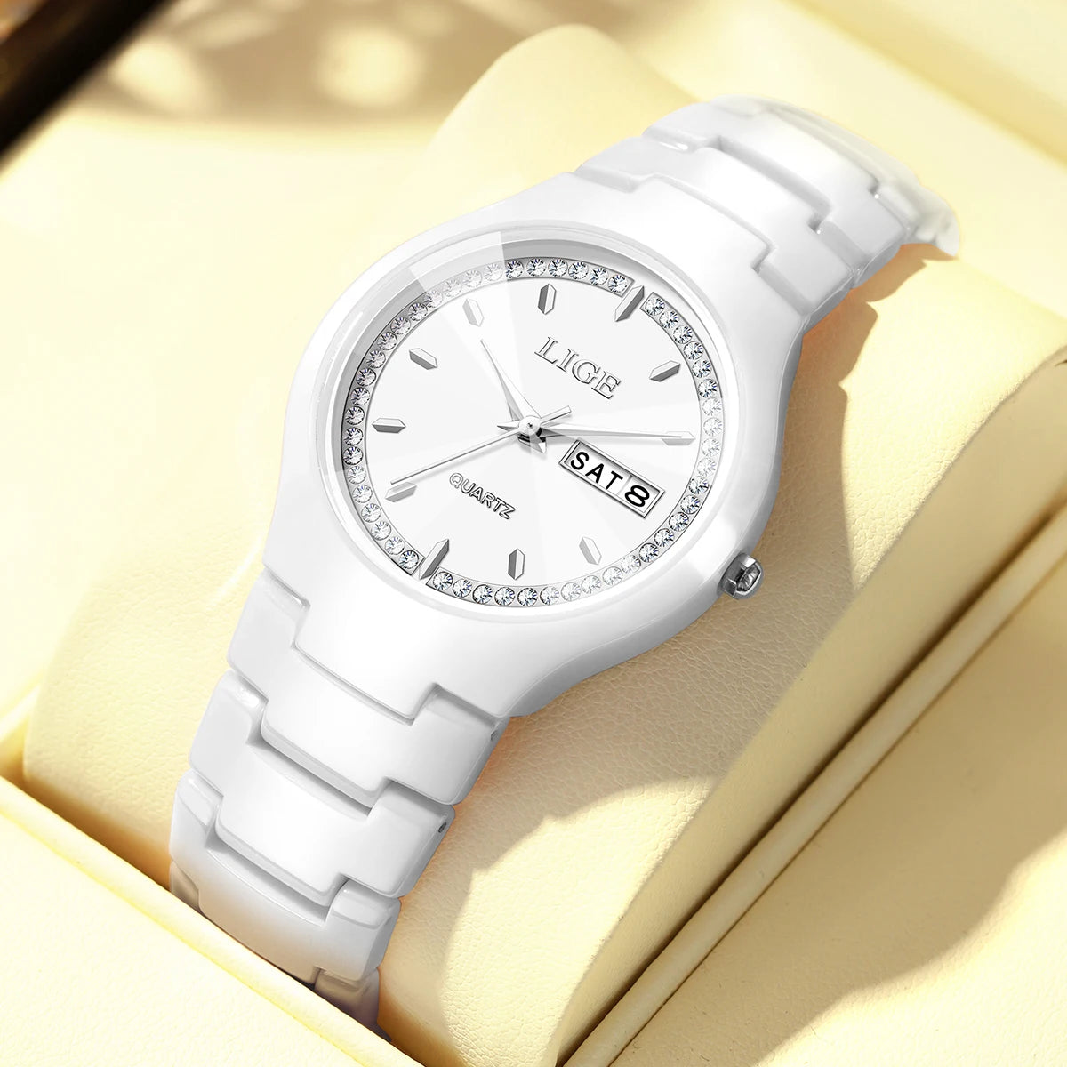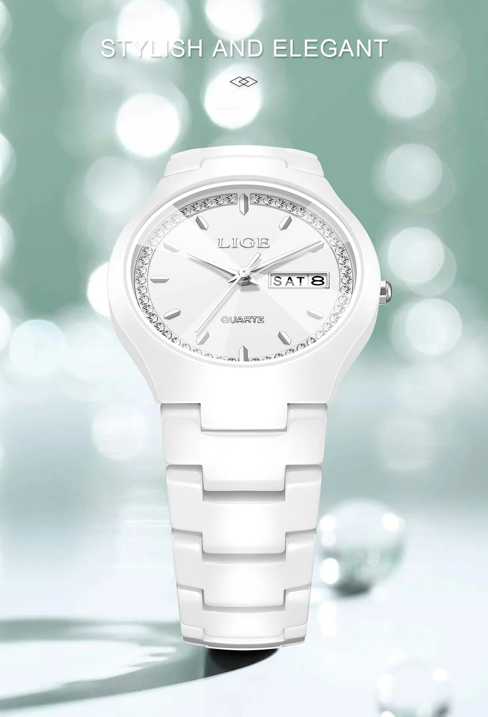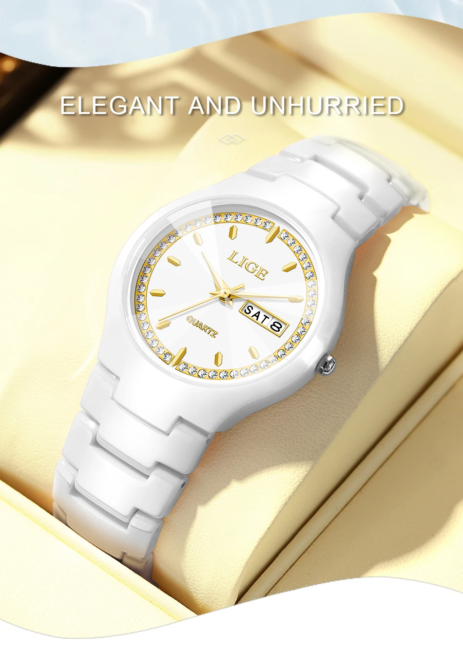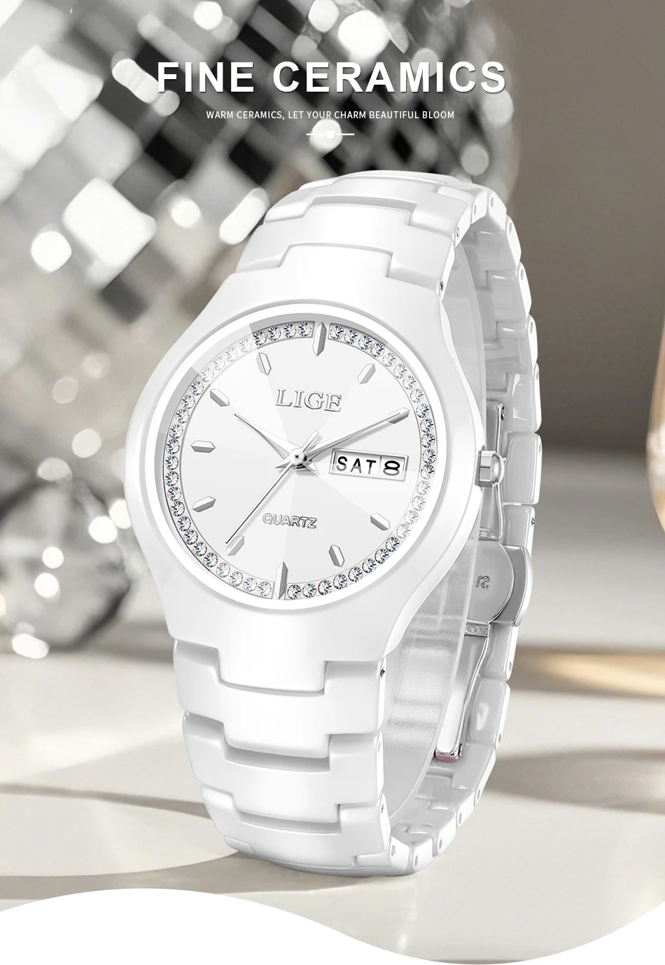 ساعة LIGE النسائية الفاخرة الأنيقة من أفضل العلامات التجارية المصنوعة من السيراميك والماس ومقاومة للماء وتقويم الأسبوع وساعات كوارتز للسيدات + علبة