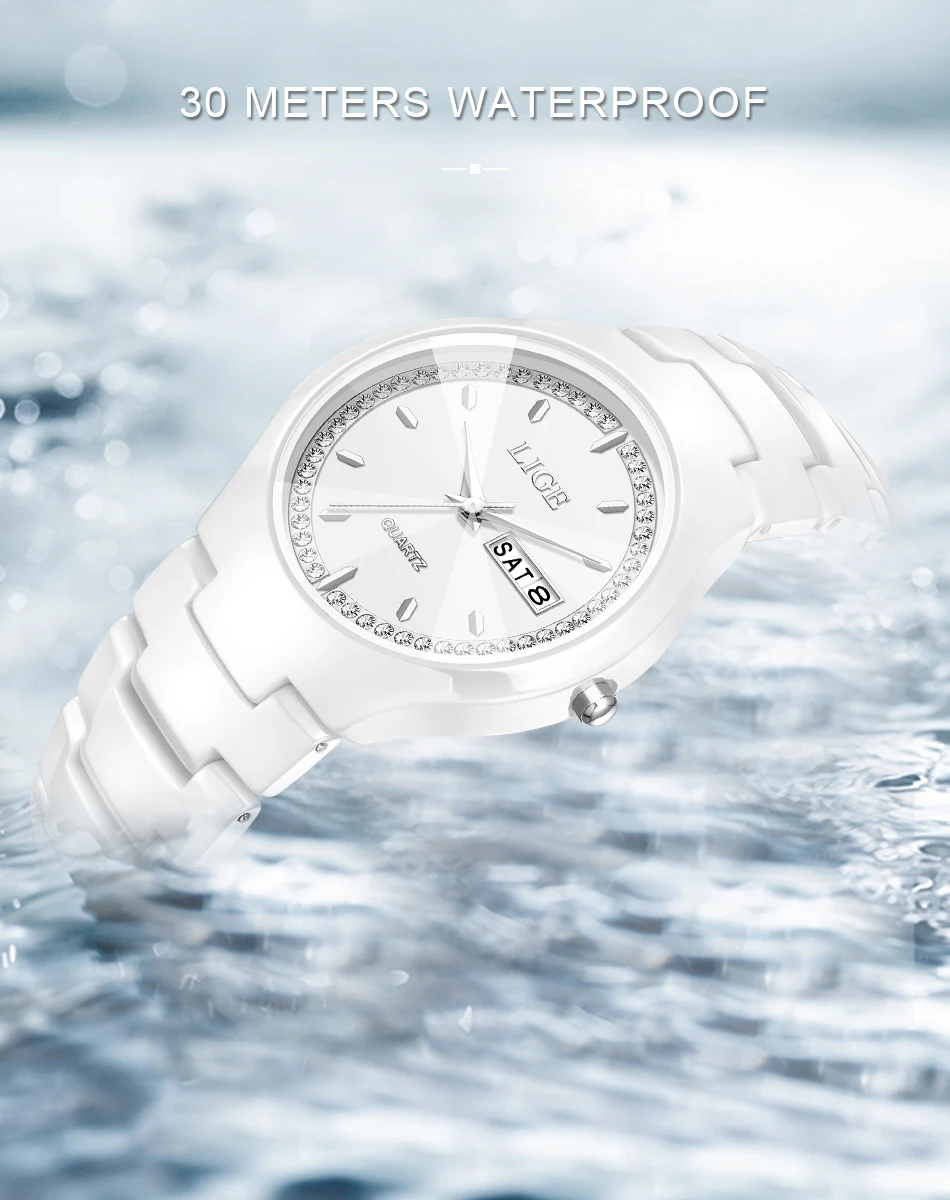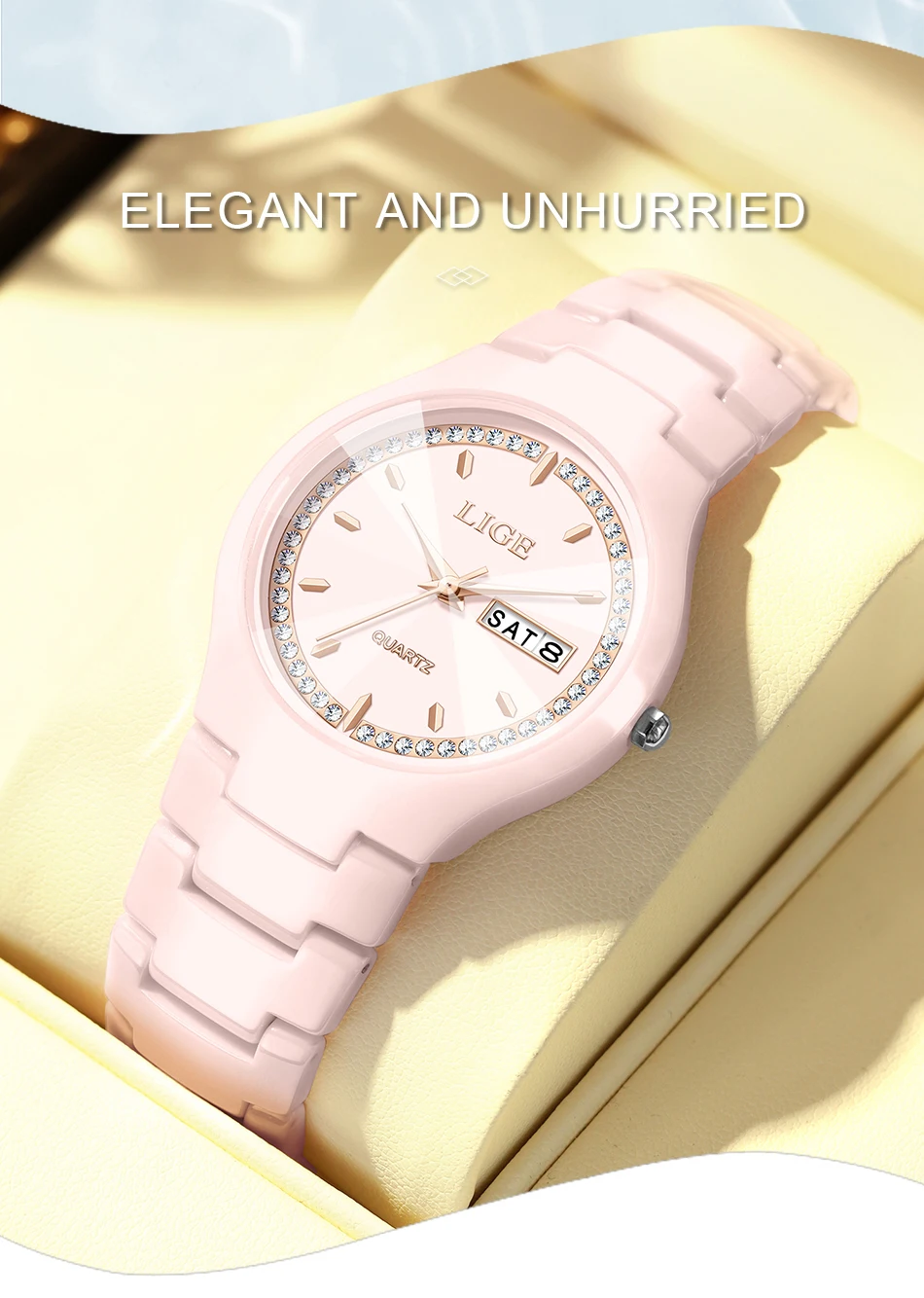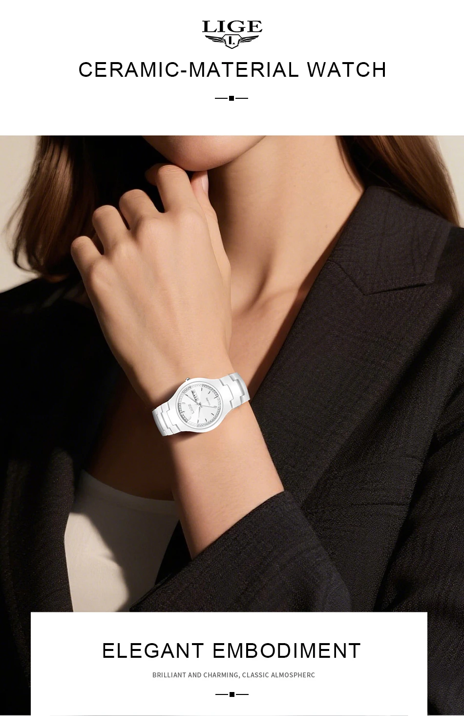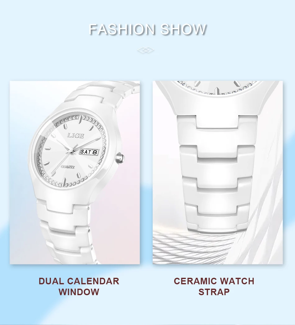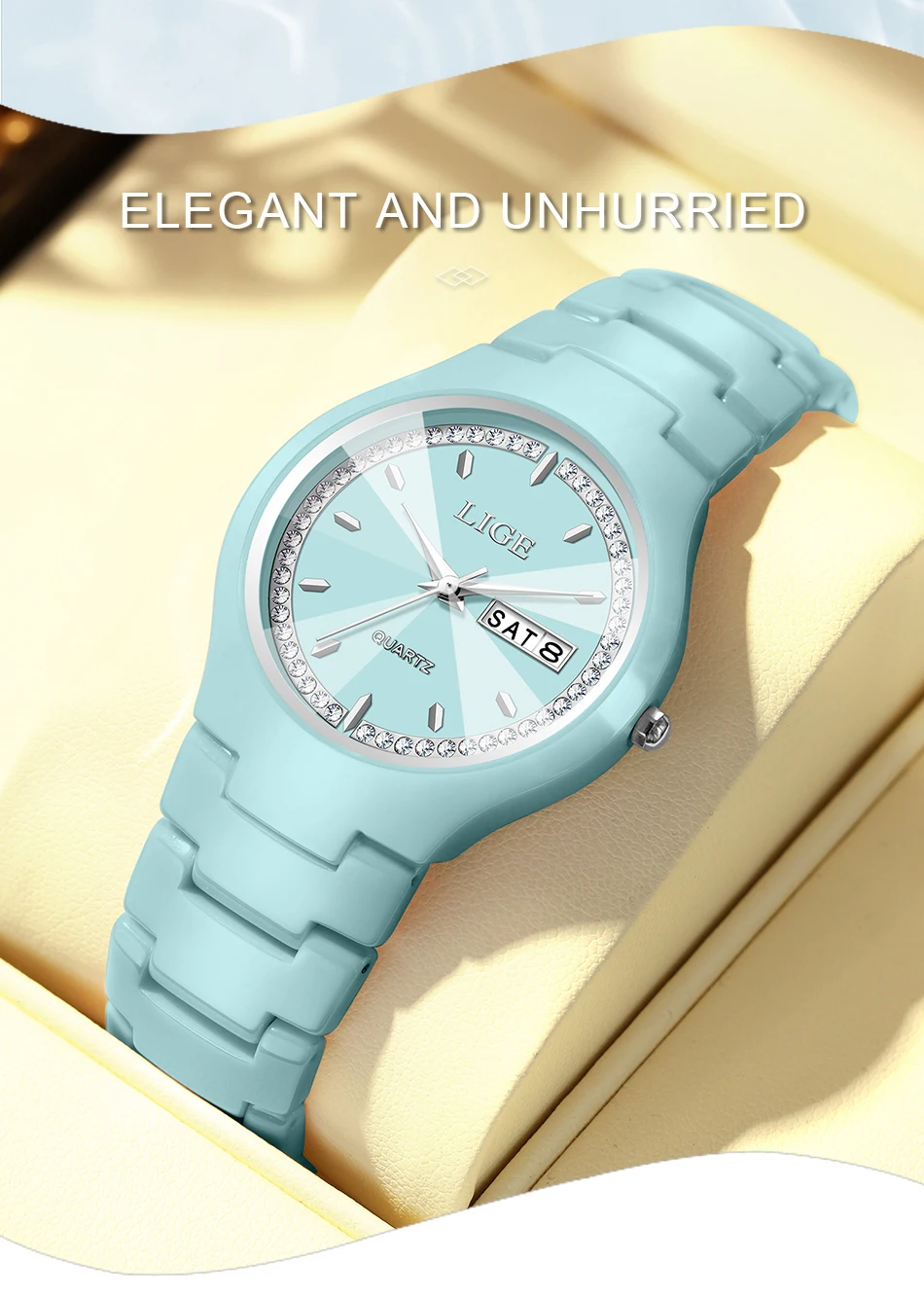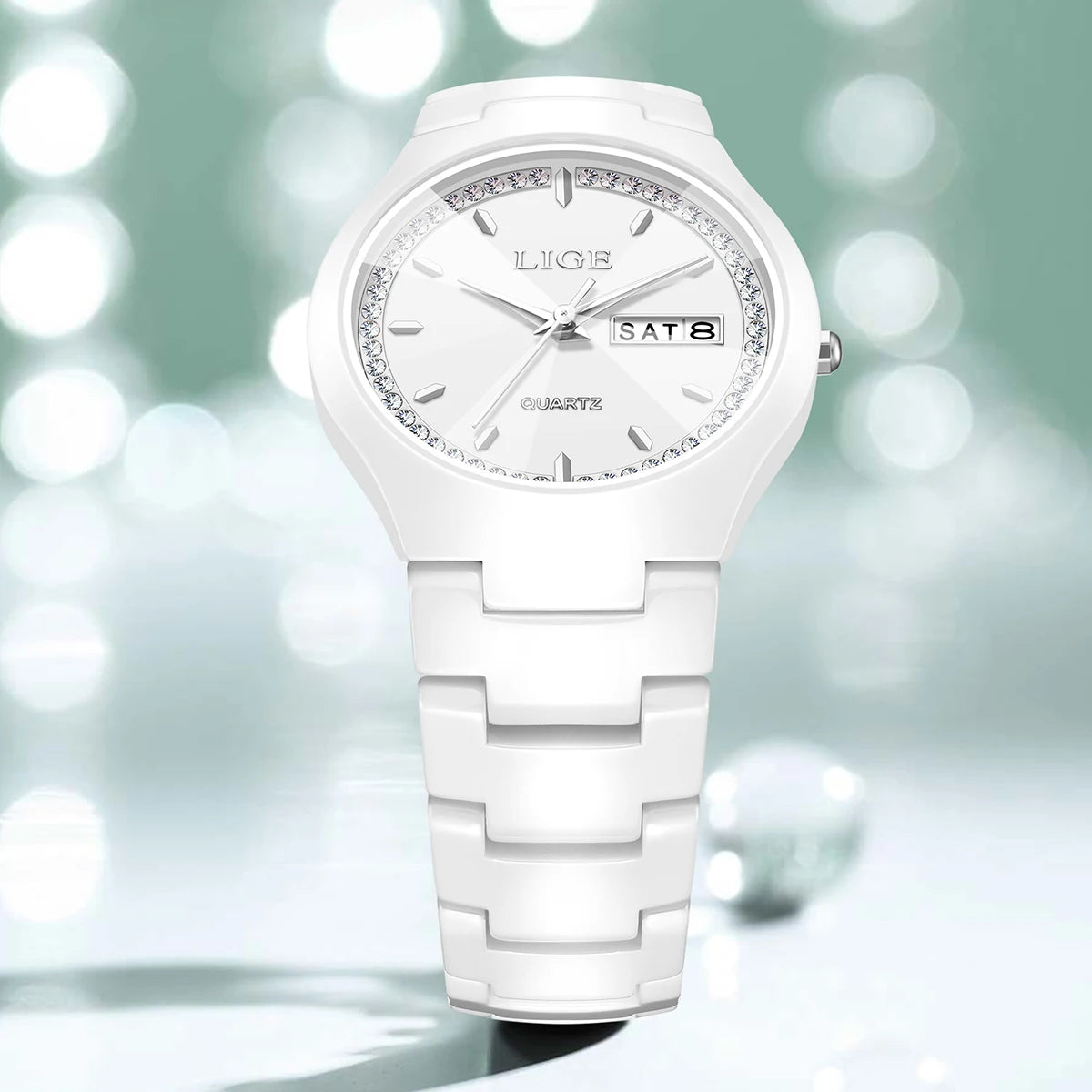 ساعة LIGE النسائية الفاخرة الأنيقة من أفضل العلامات التجارية المصنوعة من السيراميك والماس ومقاومة للماء وتقويم الأسبوع وساعات كوارتز للسيدات + علبة