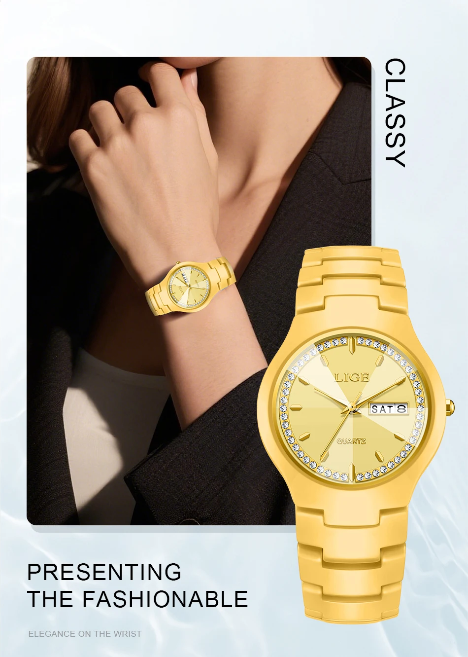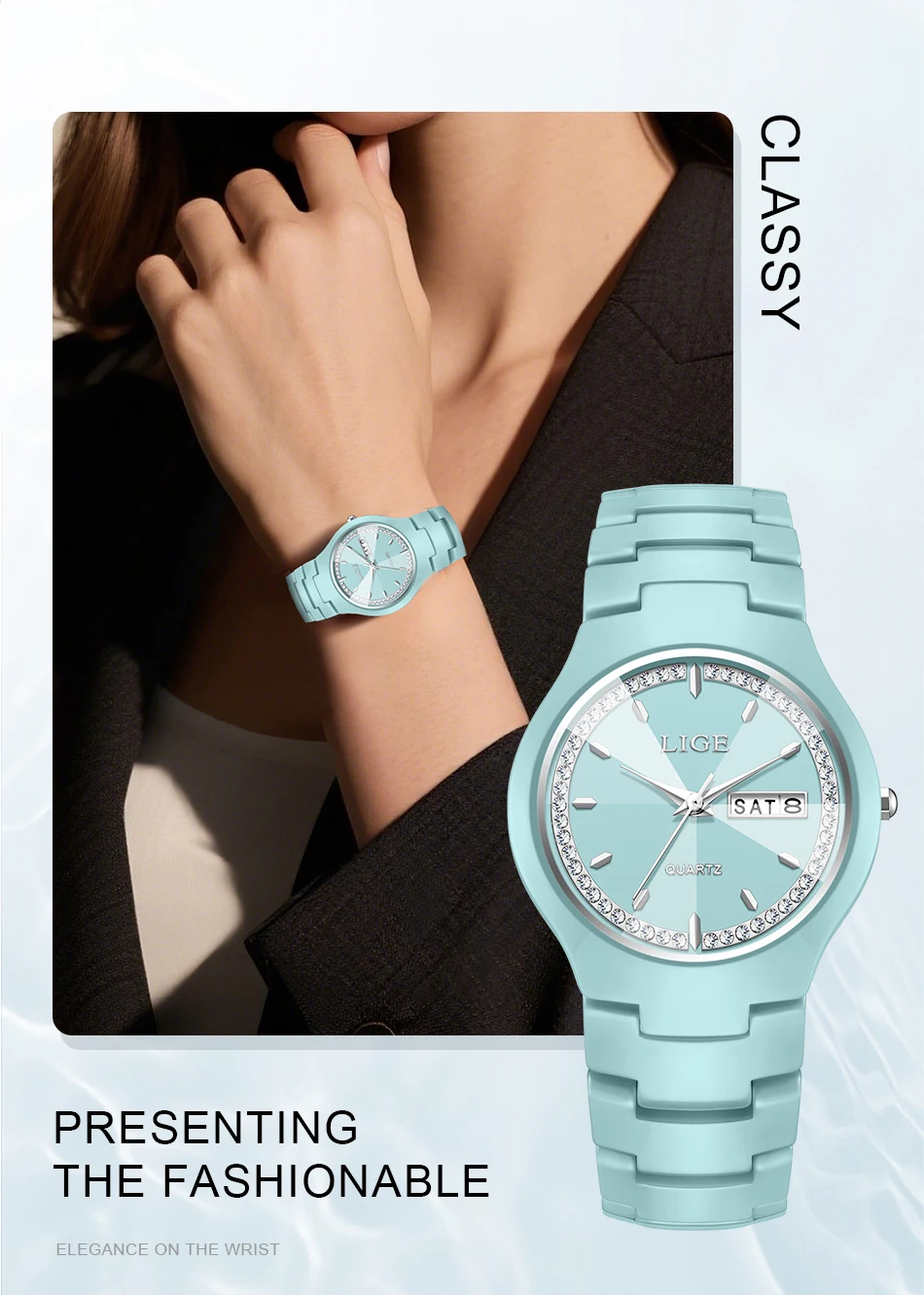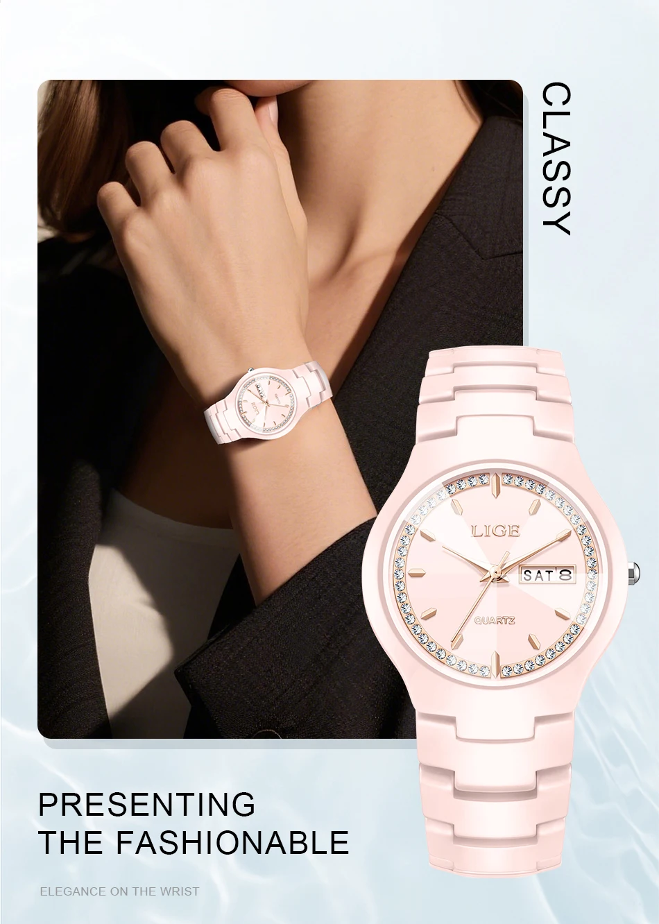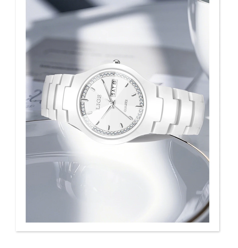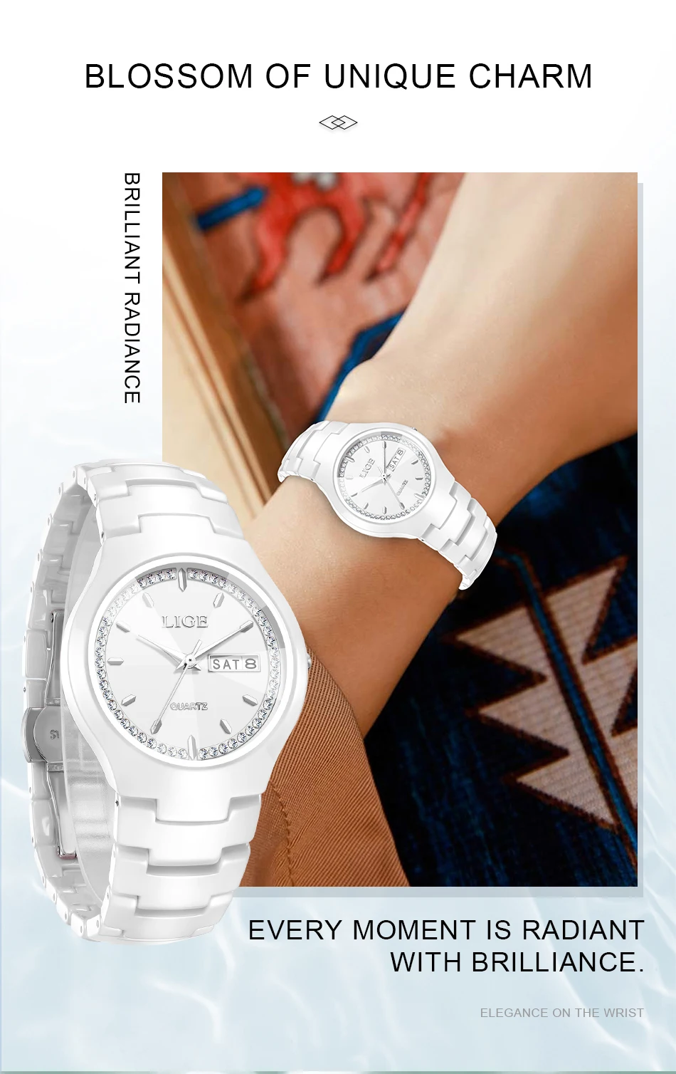 ساعة LIGE النسائية الفاخرة الأنيقة من أفضل العلامات التجارية المصنوعة من السيراميك والماس ومقاومة للماء وتقويم الأسبوع وساعات كوارتز للسيدات + علبة