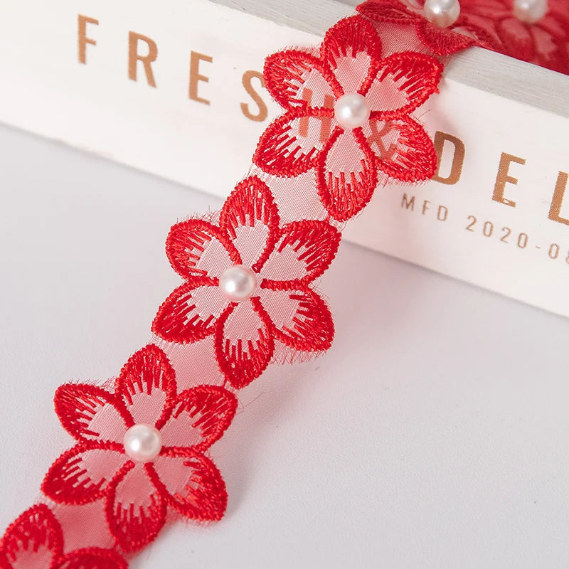 1Meter Flower Pearl Beaded Embroidered DIY Lace Ribbon Trim 35mm Wide Fringe African Lace Fabric Handmade Dress Sewing Supplies