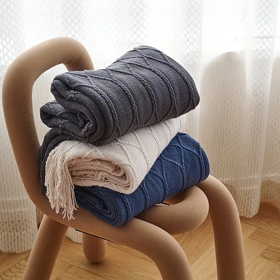 Khaki Gift Knitted Blanket with Tassels Chunky Vintage Luxury Farmhouse Throw Bedspread Oversized Blanket Cover Manta Para Sofá