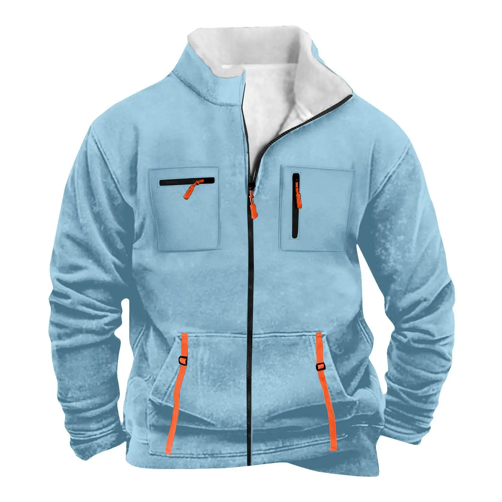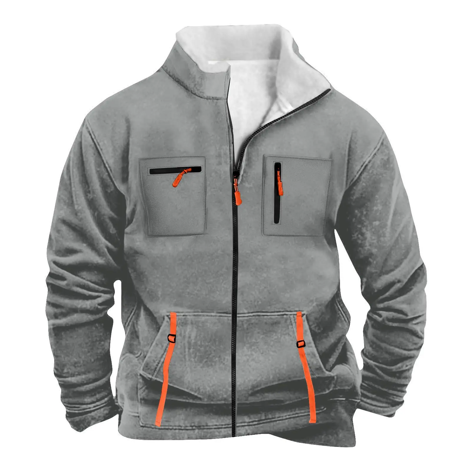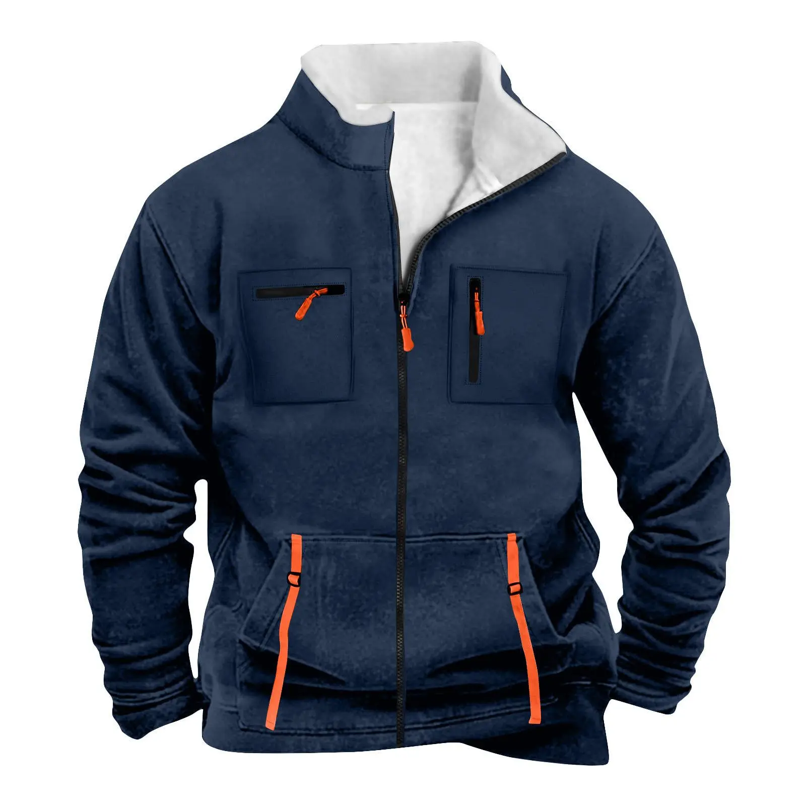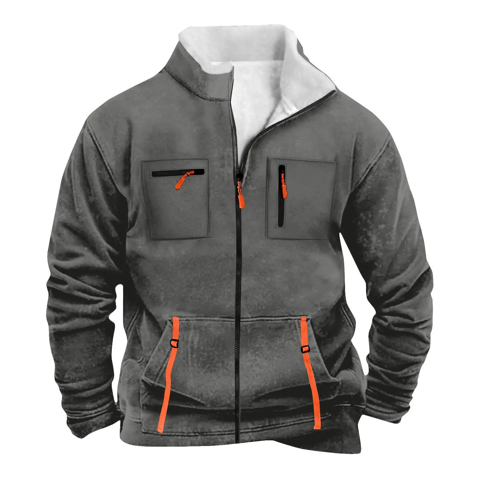 New men's autumn/winter multi-pocket zipper plain-colored pleated jacket for casual outdoor use